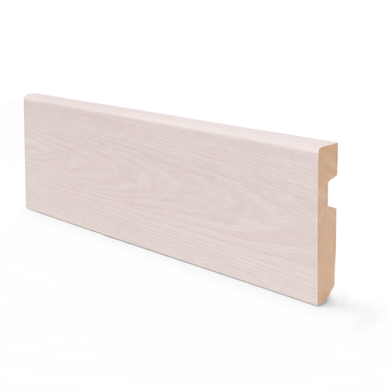 Mist Solid Wood Veneer Standard Skirting features balanced grey-beige oak tones. Its neutral finish integrates effortlessly with diverse flooring styles. Matte veneer texture maintains subtle natural elegance. Provides clean transitions and durable wall protection. Enhances visual harmony without dominating interiors.