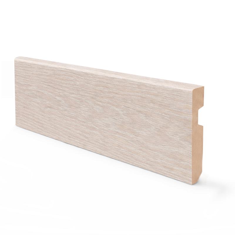 Nordic Driftwood Solid Wood Veneer Standard Skirting blends grey and beige hues elegantly. Inspired by Scandinavian interiors, it delivers calm visual transitions. Its muted veneer texture complements modern minimalist flooring. Provides durable wall protection and precise expansion gap coverage. Ensures consistent interior styling without visual disruption. Perfect for contemporary UAE spaces.