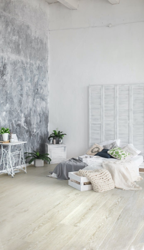 The soothing, creamy whiteness of this floor will suit those with a taste for contemporary design and minimalistic, uncluttered spaces. While its richly toned grains and beveled edges retain the cheerfully rustic essence of wood, its clear-cut white lines complement angular modern furniture designs—allowing a range of color experimentation. And style doesn’t come at the expense of comfort! This Vinyl Click floating floor construction with an underlay maximizes warmth and offers a comfortable underfoot feel.