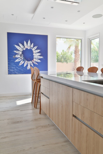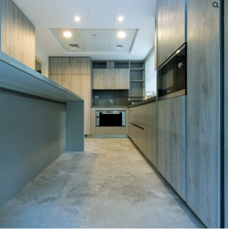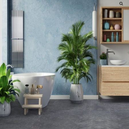 This flooring trend is well known in the context of industrial aesthetics with dark, moody tones and unfinished elements like exposed bricks. But another, increasingly popular trend is using it to complement polished, minimalist architecture. The low-shine finish can be used to counterbalance the otherwise very clean feel of these interior styles with a rough-and-ready foundation. Liquid, an SPC floor from Gerbur’s Concrete range, is a lovely example. The raw, speckled finish contrasts slick metallic décor and appliances to create a dynamic interplay of tones and textures.