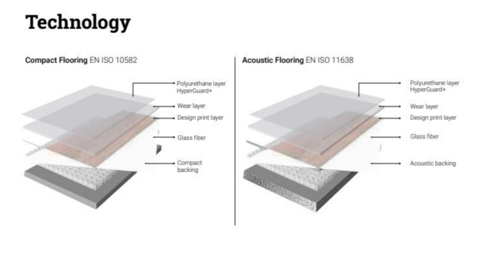 Each layer of sheet vinyl flooring is different. There’s a base layer, a layer of glass fiber that adds rigidity, the design layer, a wear layer and lastly, a polyurethane layer to seal it all in. The top layer s coated with IVC Commercial’s signature HyperGuard+, which makes cleaning even easier.