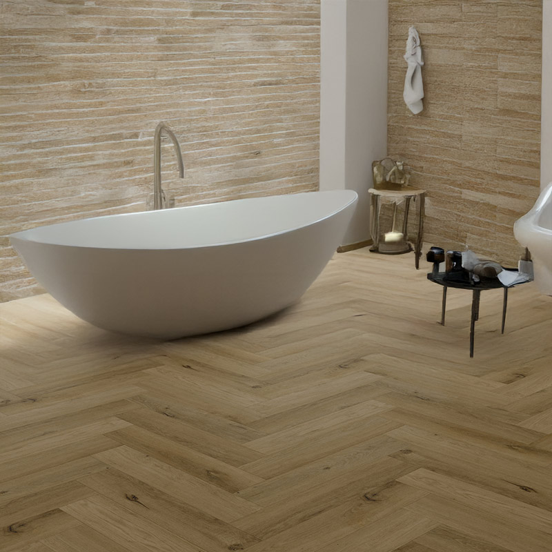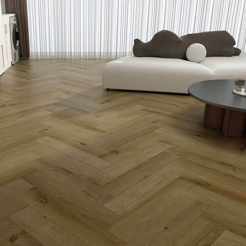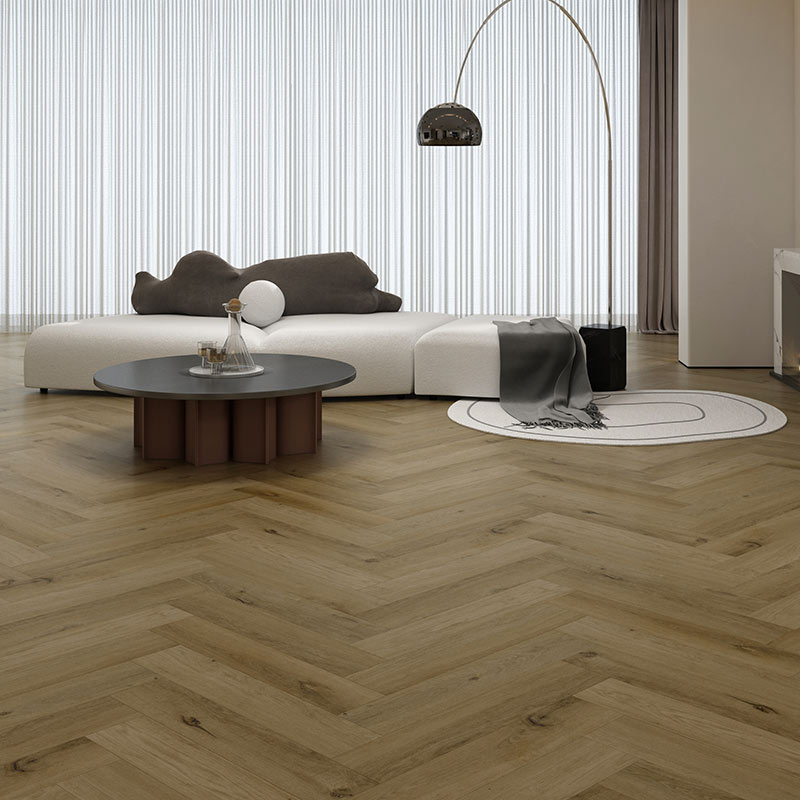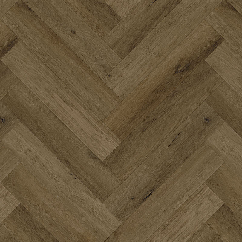 Tudar Oak reflects the warmth and depth of natural brown oak in an elegant herringbone pattern. Its water-resistant vinyl click design ensures durability, easy maintenance, and a refined wood-look finish that complements both modern and classic interiors.