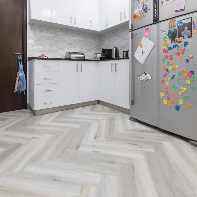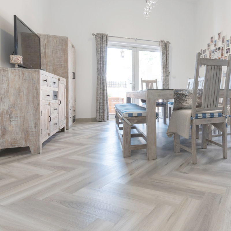 Soft Classic Oak captures the gentle elegance of pale grey tones, creating a beautifully balanced and calming effect. The refined wood texture and geometric herringbone layout bring a sense of sophistication and harmony to any space. Designed for both style and practicality, it is water-resistant, highly durable, and easy to maintain, making it perfect for modern interiors that value understated beauty and effortless comfort.