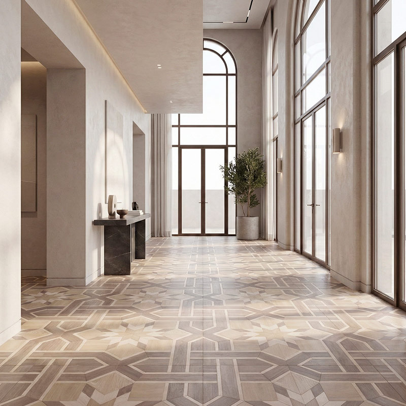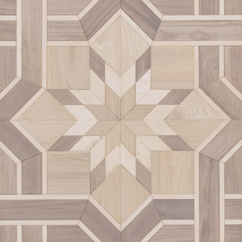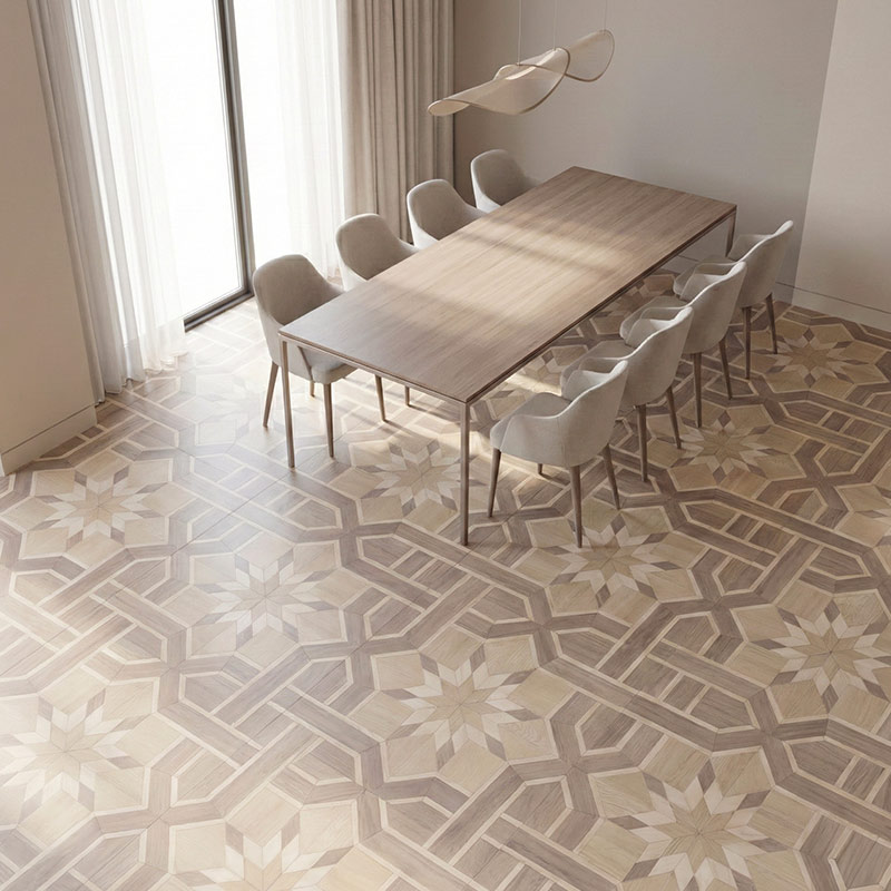 Dove introduces a deeper, cooler greige-oak tone to Art Mosaic, giving the pattern a more architectural, premium presence without becoming heavy. The slightly darker framing and contrast areas enhance the 3D “faceted” effect of the star centre and border lines, making the design feel sharper, more structured, and confidently luxurious.
