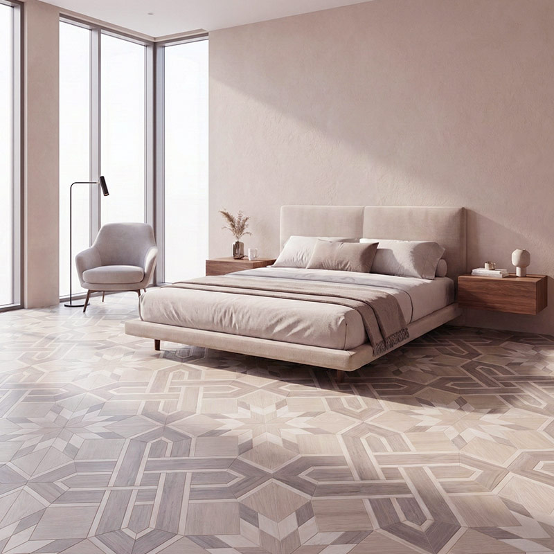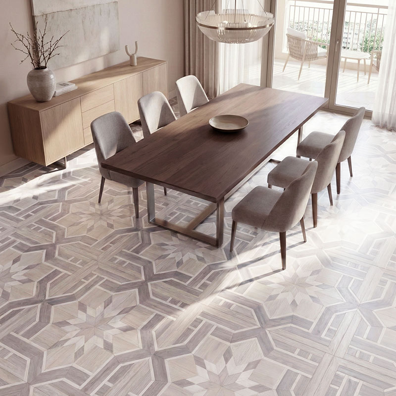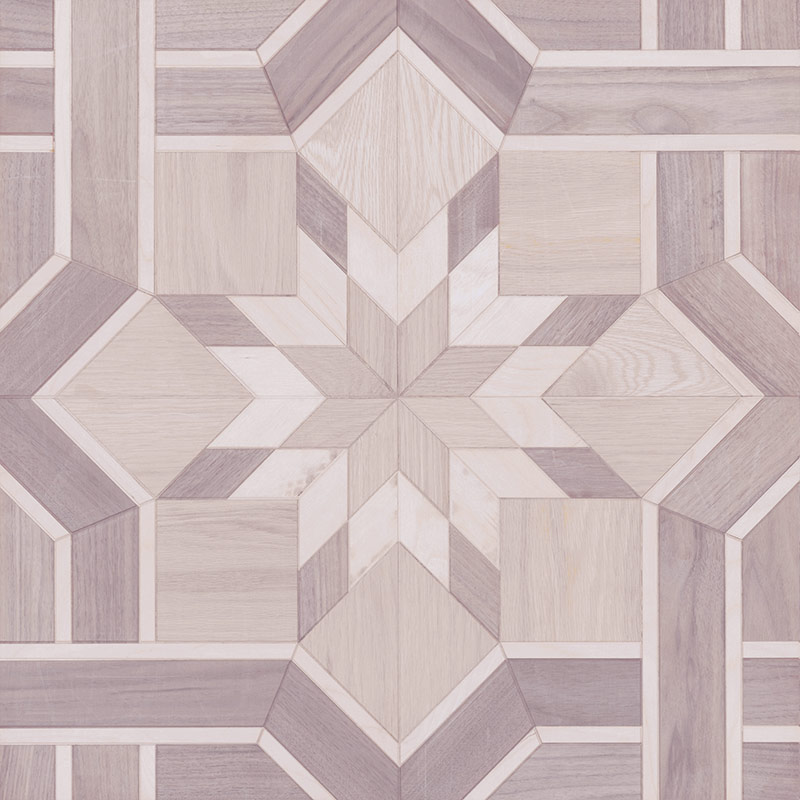 Mist applies a soft grey-beige tone to the Art Mosaic layout, offering contemporary neutrality that gently moderates the tri-wood contrasts. The shade introduces calm sophistication, allowing the pattern’s intersections to appear clean and subtly defined. Mist’s balanced palette makes the mosaic feel modern and visually composed—ideal for spaces seeking refined understatement.