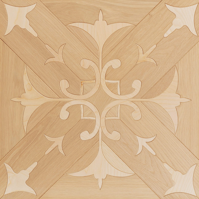 Butterscotch applies a warm golden-beige tone to the Chantilly pattern, brightening the birch-oak transitions with soft radiance. The gentle warmth complements the ornamental motif, giving the floor an inviting, naturally elegant feel well suited to light-filled interiors.