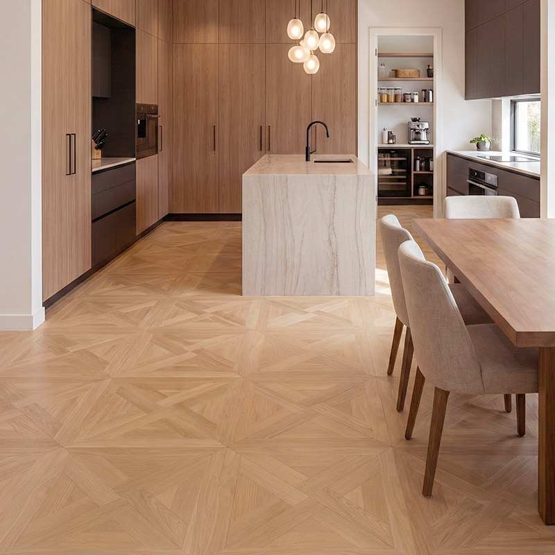 • Interlaced parquet geometry with a refined, modern feel