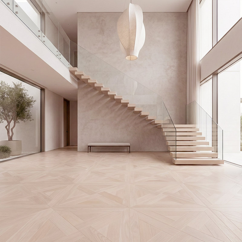 Ivory introduces a soft cream-toned oak palette that gently brightens the Elegant Weave geometry. The light, warm undertone softens the intersecting diagonal lines, giving the floor a refined, airy appearance well suited for bright, elegant interiors. Ivory maintains structure without strong contrast, making the pattern feel polished and balanced.