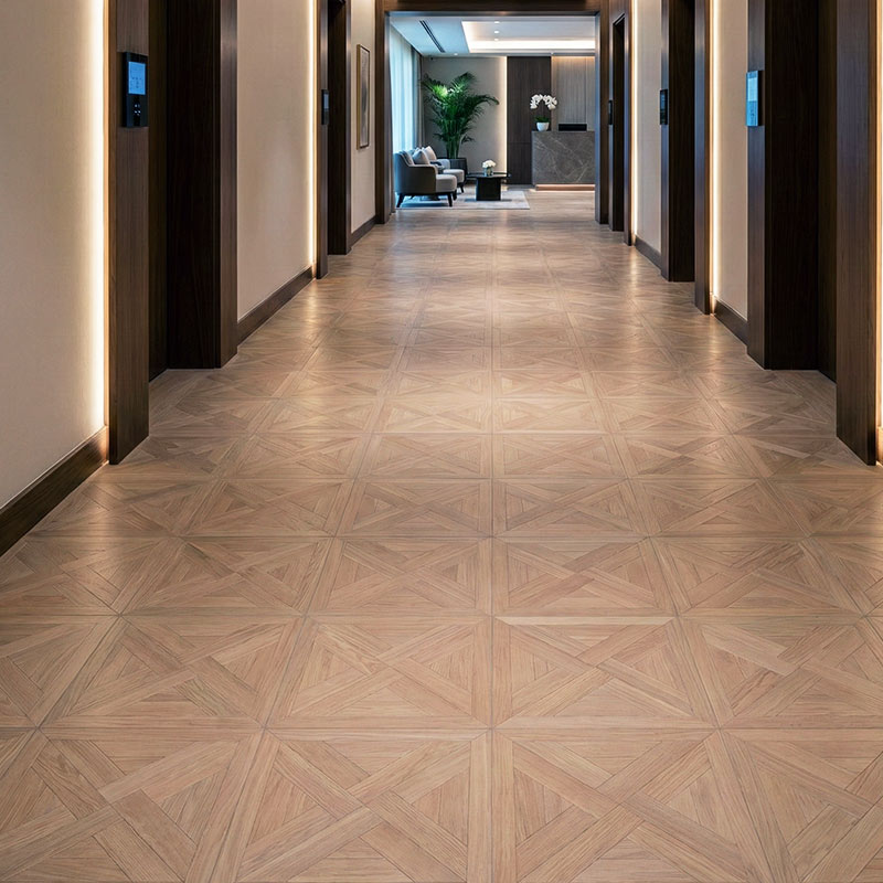 • Interlaced parquet geometry with a refined, modern feel