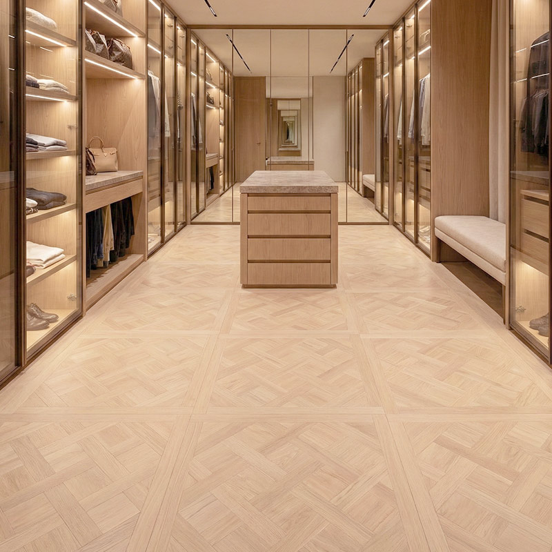 Dawn elevates the Versailles pattern with a warm mid-brown oak tone that deepens the interwoven geometry. The shade enhances the panel’s handcrafted heritage, bringing definition to the latticework while maintaining a sense of refined balance. Dawn’s warm richness suits interiors wanting a touch of classic elegance with contemporary finesse.
