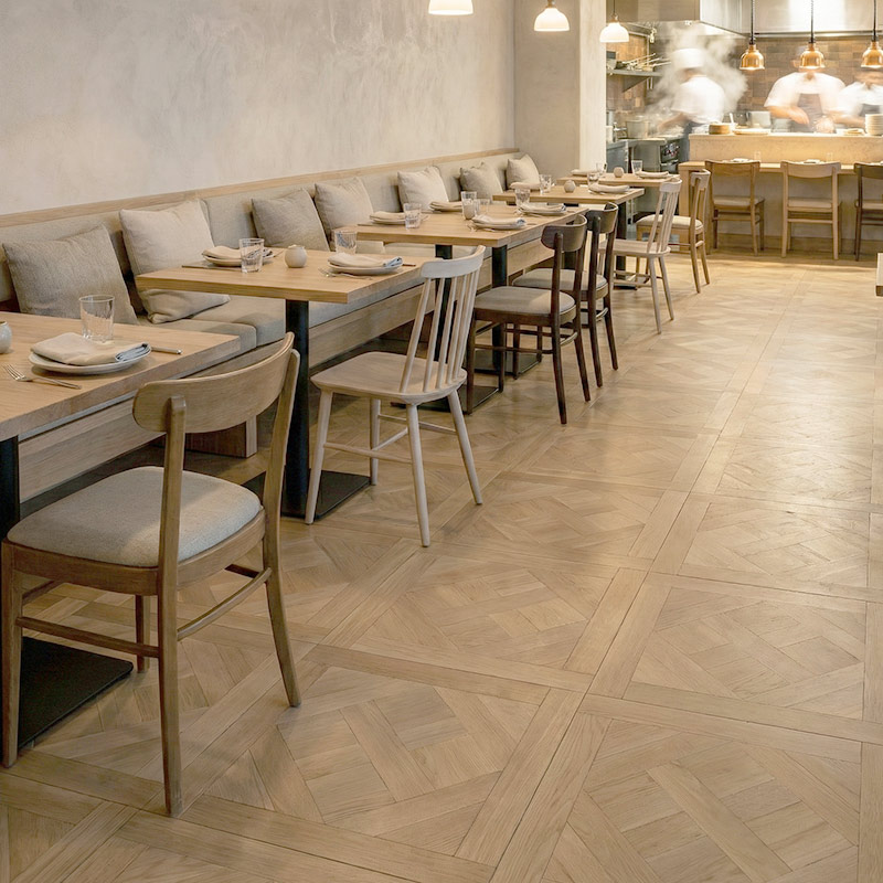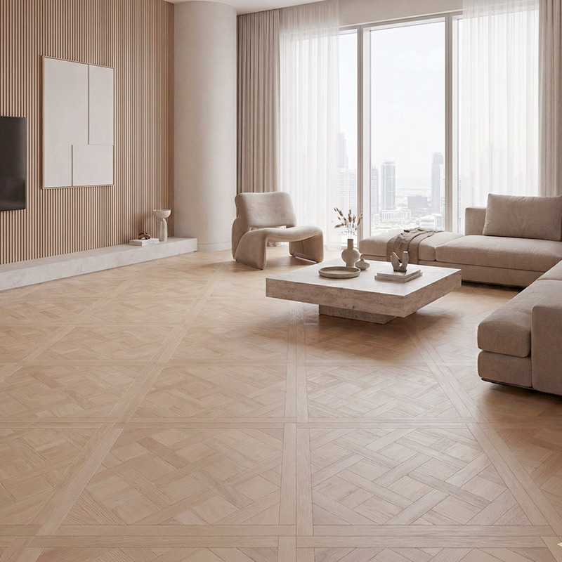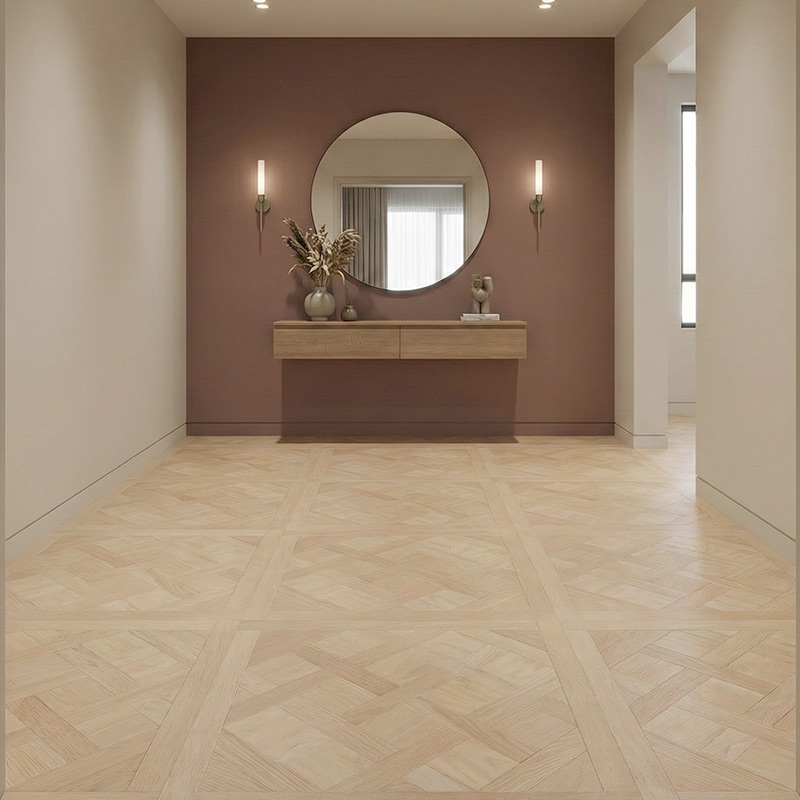 Sandcastle highlights the Versailles structure with a natural oak tone featuring visible grain movement that enhances the woven geometry. The mid-tone warmth introduces organic authenticity, making the classic château layout feel approachable and well-balanced. Sandcastle provides both texture and comfort, ideal for natural-inspired interiors.