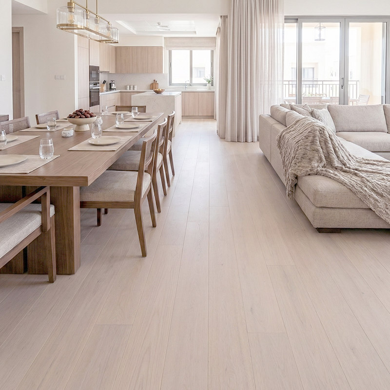 In the Bernera Supreme range, Ivory presents a refined French Oak tone designed for interiors that value clarity, proportion, and material authenticity. The Supreme-grade selection minimises knots and visual noise, allowing the grain to read as calm and controlled. Across larger spaces, the wide plank format supports a continuous, architectural flow—helping the floor complement the room rather than dominate it.