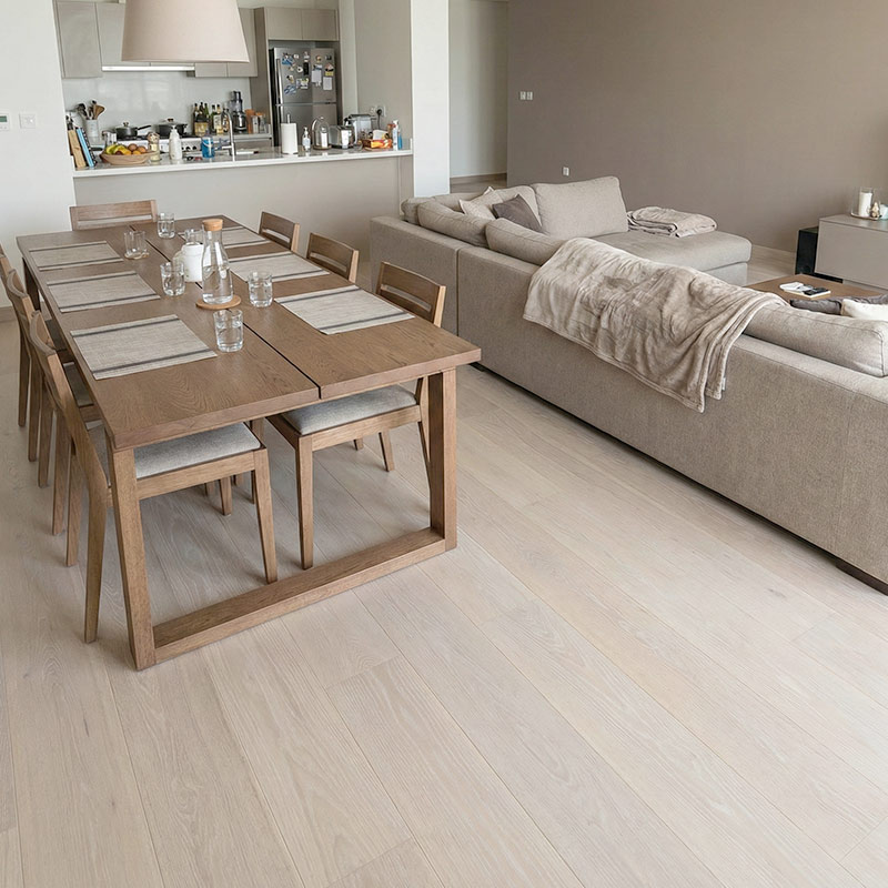 Nordic Driftwood presents a refined French Oak tone designed for interiors that value clarity, proportion, and material authenticity. The Supreme-grade selection minimises knots and visual noise, allowing the grain to read as calm and controlled. Across larger spaces, the wide plank format supports a continuous, architectural flow—helping the floor complement the room rather than dominate it.