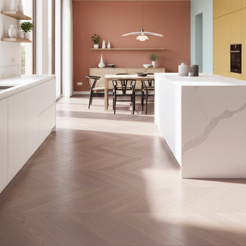 Floorworld offers an end-to-end flooring solution for Royal Parquet – Chevron, from expert product selection to professional glue-down installation and long-term aftercare. Our specialists guide you in choosing the ideal European oak grade, chevron layout, finish, and board dimensions, ensuring every floor is installed with precision, stability, and exceptional craftsmanship—perfectly suited to UAE conditions.