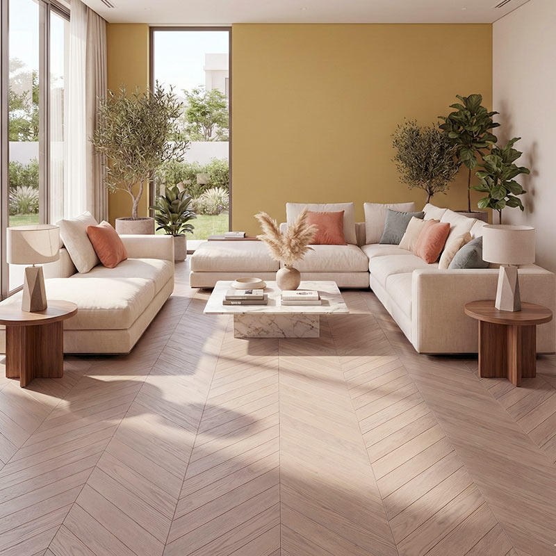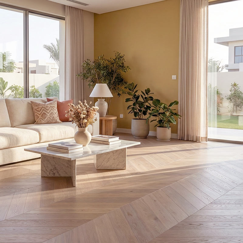 Floorworld offers an end-to-end flooring solution for Royal Parquet – Chevron, from expert product selection to professional glue-down installation and long-term aftercare. Our specialists guide you in choosing the ideal European oak grade, chevron layout, finish, and board dimensions, ensuring every floor is installed with precision, stability, and exceptional craftsmanship—perfectly suited to UAE conditions.