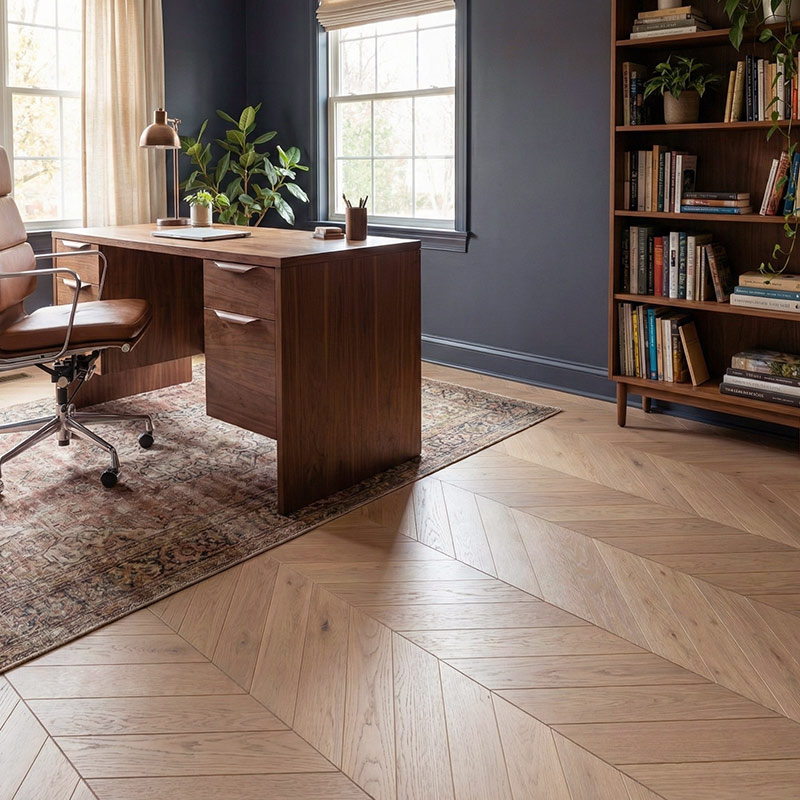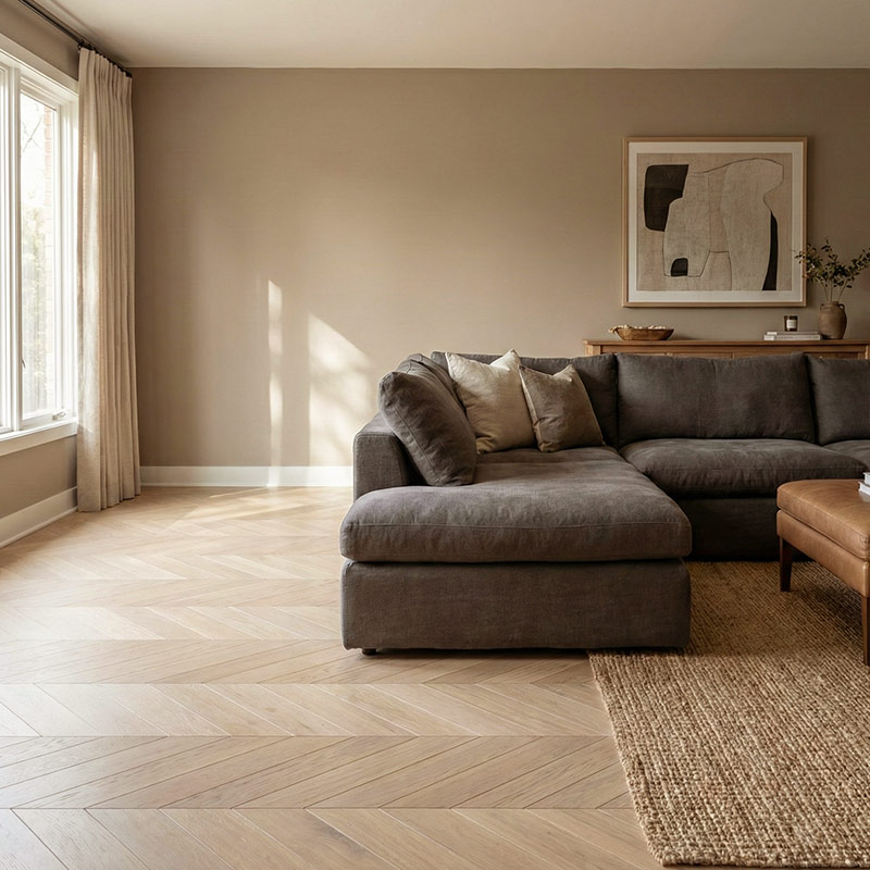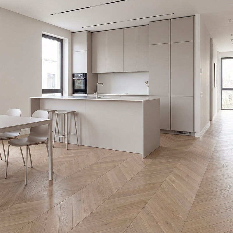 Swiss Hardwoods Chevron is designed for homeowners and designers who want floors that feel both stylish and timeless. The angled planks add architectural rhythm, while the Classic Grade oak ensures a calm, elegant surface without busy knot patterns.