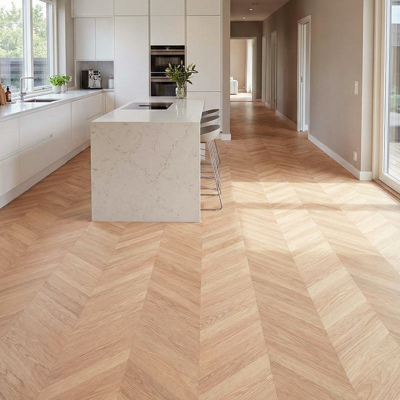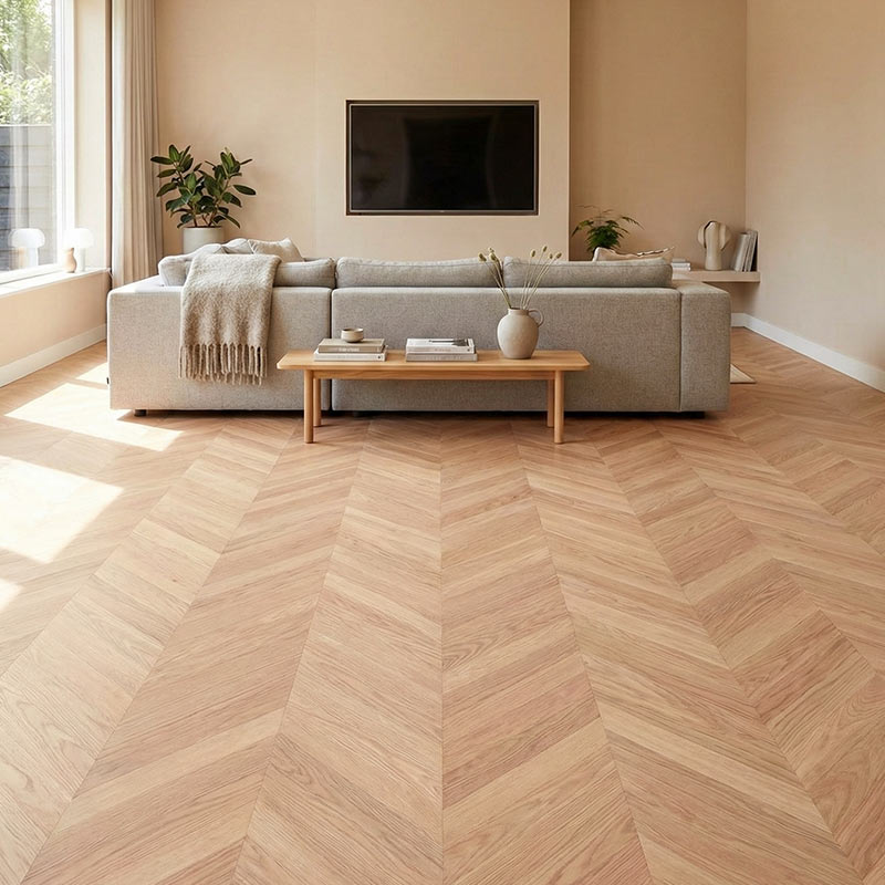 Swiss Hardwoods Chevron is designed for homeowners and designers who want floors that feel both stylish and timeless. The angled planks add architectural rhythm, while the Classic Grade oak ensures a calm, elegant surface without busy knot patterns.