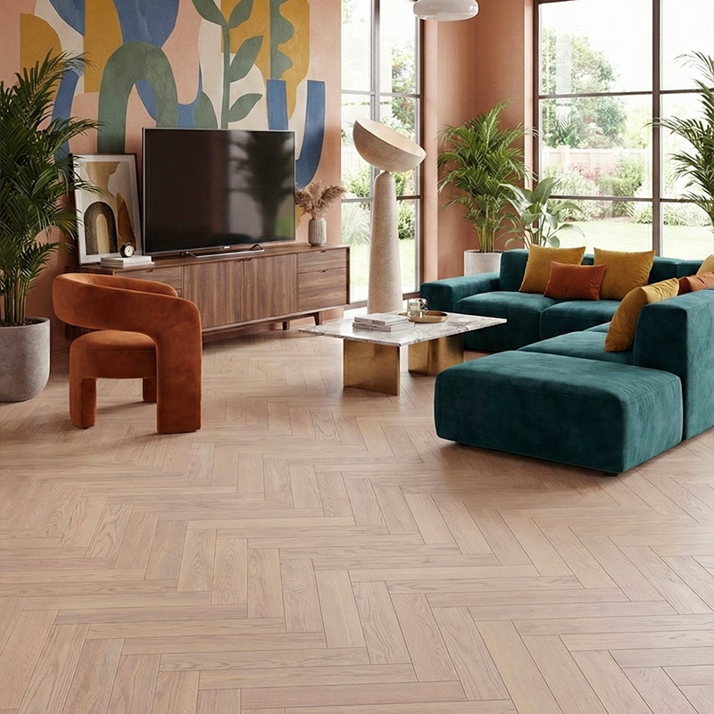Swiss Hardwoods Chevron is designed for homeowners and designers who want floors that feel both stylish and timeless. The angled planks add architectural rhythm, while the Classic Grade oak ensures a calm, elegant surface without busy knot patterns.