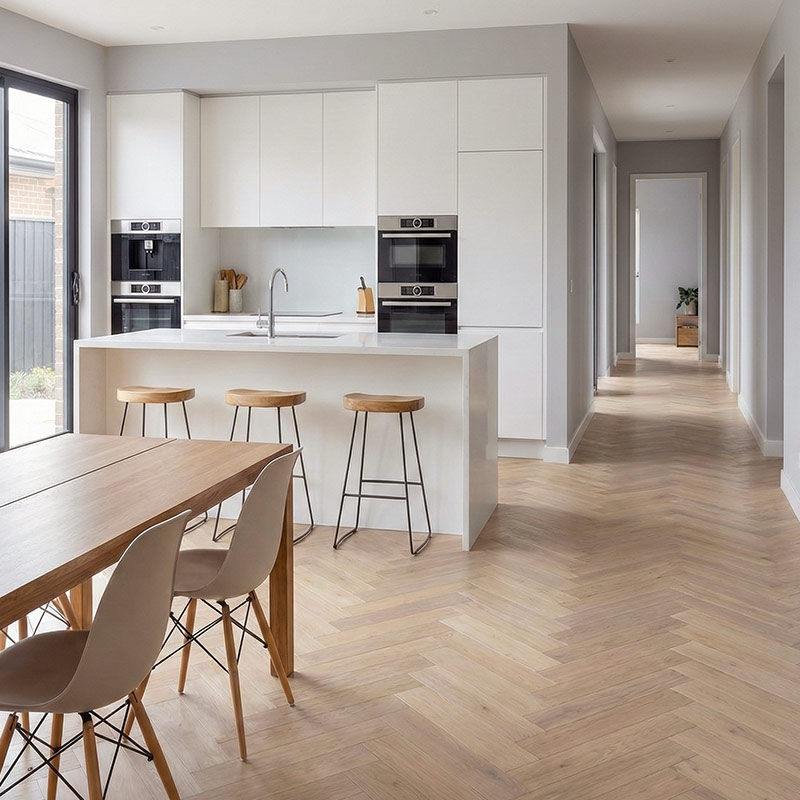 In Eternal Herringbone’s 90 × 600 mm dimension, Biscuit delivers a pleasing visual flow that brings rooms together. It works well with both light and mid-tone furniture, helping interiors feel cohesive and harmonious. Combined with Swiss Hardwoods’ durable engineered construction and 25-year residential / 10-year commercial warranty, Biscuit offers long-lasting comfort and style.