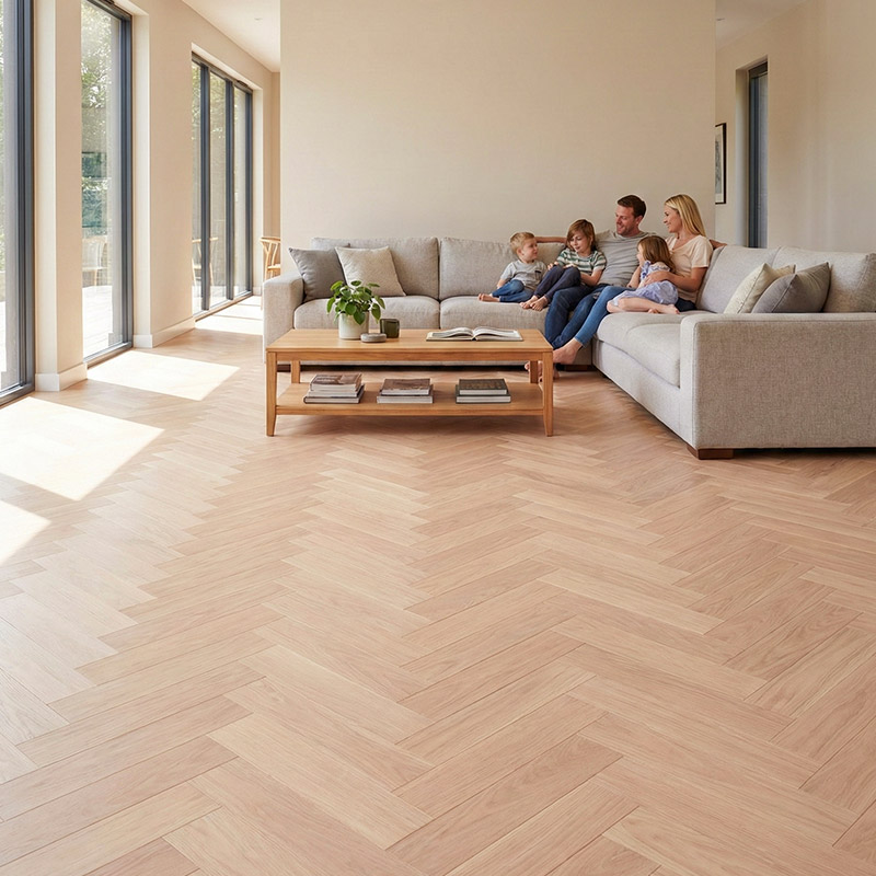 Swiss Hardwoods Chevron is designed for homeowners and designers who want floors that feel both stylish and timeless. The angled planks add architectural rhythm, while the Classic Grade oak ensures a calm, elegant surface without busy knot patterns.